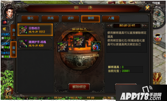 装备解绑功能,适用于装备上架拍卖行交易前使用。(小编不建议平时让装备处于非绑状态。)