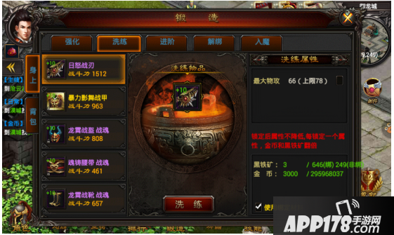 通过花费黑铁矿和金币,提升装备的洗练属性。需要注意的是,勾选锁定属性不降低的情况下,需要花费更多的黑铁矿及金币。