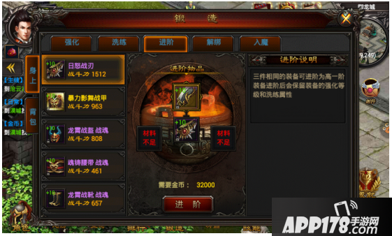 随着人物不断的成长,装备进阶功能会更为重要。三件相同装备可进阶为更高一阶装备,进阶后仍会保留主装备的强化等级和洗练属性,材料装备消失。