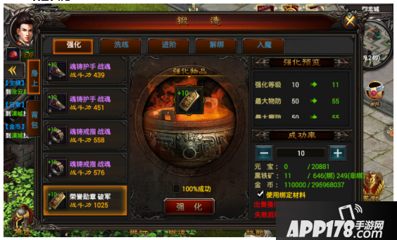 装备强化需要花费黑铁矿和金币,当然也可以使用元宝来提升强化成功率。强化过的装备在出售给系统后会返还强化卷,使用后即可让装备瞬间达到对应强化等级。