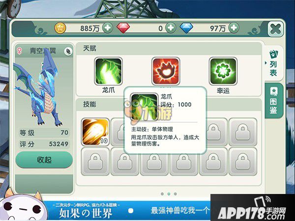 【蓝龙】的天赋技能——龙爪啦!蓝龙是受到光之神眷顾的神兽,可爱的外表下隐藏着可怕的实力。龙爪是单体物理技能,顾名思义就是用龙爪来攻击敌方单人,在PVP集火中可以造成巨大的伤害哟!