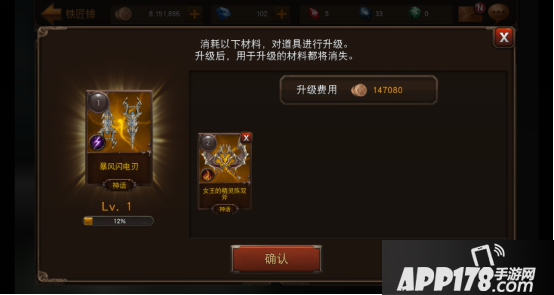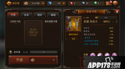进入铁匠铺后,我们可以看到四个选项菜单,分别是升级、合成、升级以及超越;我们用“升级”选项先做一个示范,升级可以用你不需要的装备为你的现有装备提升等级,点击升级选项并选择需要升级的武器,再选择材料道具。