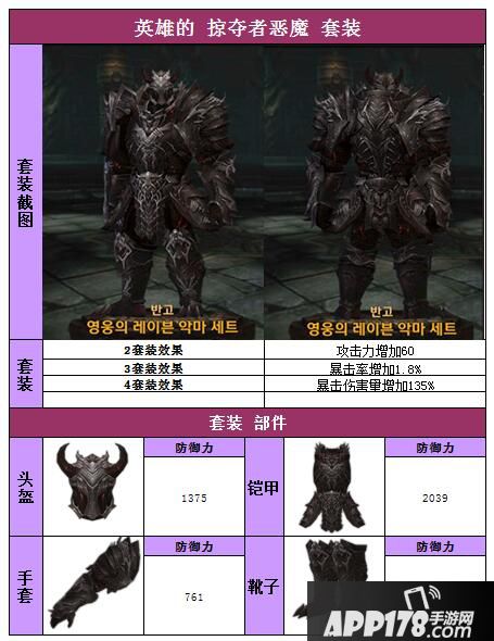 以上就是raven掠夺者盘古英雄恶魔套装属性图鉴的全部内容,希望能给喜欢英雄恶魔套装的小伙伴们带来帮助。更 多相关攻略稍后送上~请继续关注APP178手游网~更多精彩期待你的分享~