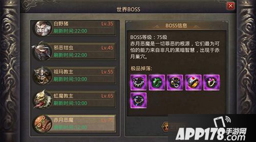 在白日门中,有着让无数玩家闻风丧胆的BOSS——赤月恶魔。通过白日门野外的传送点,穿过无数的迷宫和密道就可以到达赤月巢穴。目前BOSS中血量最高的赤月恶魔不得不说是让不少玩家为之头疼的BOSS之一。虽然体型庞大不能移动,但这并不影响它放出招式的伤害力,再加上那庞大的体力值。可以说赤月恶魔是最为耗时的BOSS!因此,想要击败赤月恶魔,除去拥有30000以上的战斗力外,搜集足够的太阳水和还魂丹以便及时补充体力也是十分必要的!击败BOSS虽然困难,但得到的奖励却也十分的丰富,稀有首饰、熔炼矿石、祝福油、玄冰铁、技能残页等等。其中稀有首饰就有战士的圣战项链、圣战戒指、圣战手镯,道士的天尊项链、天尊戒指、天尊手镯以及法师的法神项链、法神戒指、法神手镯,这么多的顶级装备,你有没有心动呢?