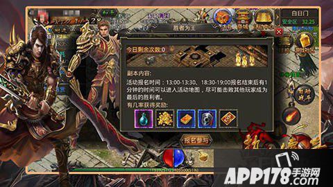 每30人一个副本,副本中玩家可以自由PK,而且在副本中是不计红名,不爆装备的,这里,只有个人之间的PK与厮杀。需要注意的是,在副本中死亡后是不可复活,一旦死亡就只能选择观看或者离开副本了。对于那些战力低的玩家,最好的建议就是不停的跑,只要你速度够快,可能幸存者中就有你的存在。副本中除了玩家的攻击外,你还需要注意地图中间的火墙,那火墙也是有攻击力的。副本中每隔30秒就会刷新的3枚神符,它不仅回复血量,还能增加攻击20s,增加防御20s,对于低、中级玩家,这个还是可以来一发的。