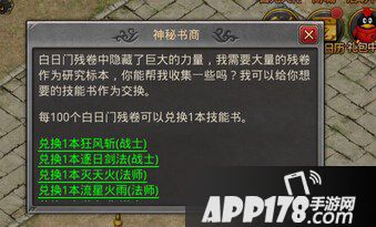 5、神秘书商:在白日门中有一个NPC叫神秘书商,在神秘书商那里我们可以使用100张白日门残卷去兑换狂风斩的。