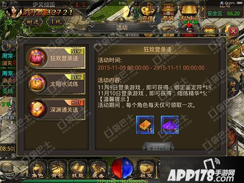 APP178手游网>热血传奇手机版>游戏攻略>狂欢登录送 登录就送鉴定符和熔炼精华