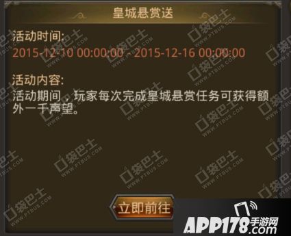 活动期间,玩家每次完成皇城悬赏任务可获得额外一千声望。