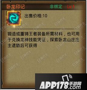 卧龙印记是锻造或重铸王者装备所需材料,也可用于兑换龙神技能凭证,探索卧龙山庄庄主的遗骸后可获得。