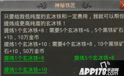 +10玄冰铁提纯方法:提取一个需要+8玄冰铁4个,+10黑铁矿石10个,50万金币