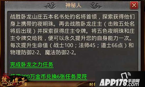 后期才开放的卧龙之力任务也是必做的,200次可获得非常高的生命和双防加成。而且基本是没什么花费,只要金币兑换任务灵符,探索古书名将和庄主遗骸获得五色夜明珠和庄主令牌,就可以永久提升自身属性一次。单天是免费刷2次古书名将和庄主的,跑的快的话,一天可以做个五六次卧龙之力任务,属性加成非常可观。