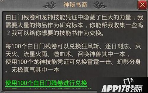 在白日门地图NPC神秘书商处,消耗100个白日门残卷可兑换三职业的高级技能书,包括战士职业的狂风斩和逐日剑法、法师职业的灭天火和流星火雨、道士职业的嗜血术和召唤神兽。在学习这几个高级技能后,三职业的战斗力和输出伤害都将得到大幅提升。