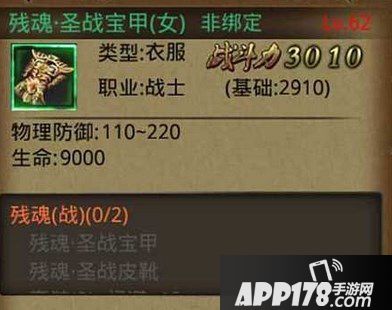 概述:残魂装备可以用以和圣战装备比对,残魂装备虽有不同的佩戴等级限制,但装备的基础战斗力要比圣战装备高,但具体属性要差一点。不过残魂装备除了基础属性外,有额外的套装属性加成,即装备残魂·圣战宝甲和残魂·圣战皮靴,可以为角色增加10点的闪避值;装备残魂·圣战头盔和残魂·圣战腰带,角色可以获得20点的韧性加成。