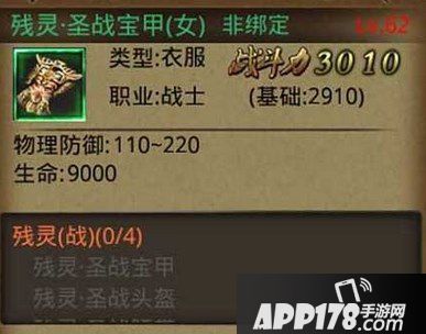 概述:残灵装备也可以用以和圣战装备比对,和其他残系装备一样,残灵装备也是有等级限制的。残魂装备装备的基础战斗力要比圣战装备高,但装备属性要差一点。装备4件残灵装备可以获得非常不错的属性加成。