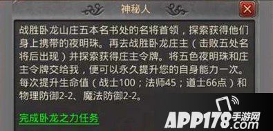 玩家通过使用任务灵符探索五位古书名将和卧龙庄主的遗骸后,可获得5种(红色、绿色、黄色、蓝色、橙色)不同颜色的夜明珠和1个庄主令牌。集齐这两样东西,在卧龙山庄内的神秘人处,点击完成【卧龙之力任务】,即可获得生命值、物理防御和法术防御三个永久属性的提升。单次提升属性中,物理防御和魔法防御值都是2-2,不过生命值属性在三职业上的提升都是不一样的,战士、法师和道士可分别获得100点、45点和66点的生命值提升。玩家最多可通过此途径提升200次自身的永久属性,对角色的属性和综合战力还是有着很明显的提高的。