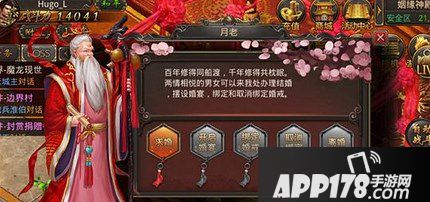 在月老处,夫妻双方可以进行炫耀、开启婚宴、绑定婚戒、取消绑定和离婚操作。开启婚宴需要花费520元宝,并即刻进入婚宴地图,婚宴时长1小时。夫妻双方均可得到1张婚宴请帖。可在聊天框内发送该道具名称,并邀请好友参加婚宴,分享喜悦之时更能加深彼此的感情。