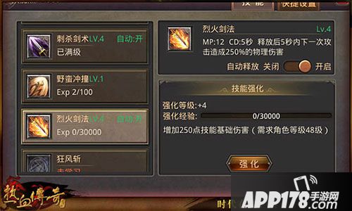 战士在前期,主要用的技能就是刺杀剑术和烈火剑法。平时刷图、PK基本都是用这两个技能来打出伤害。只有在地下夺宝、团战需要切割战场,改动位置的时候,才会偶尔用一下野蛮冲撞。所以前期建议将刺杀剑术、烈火剑法强化满级。