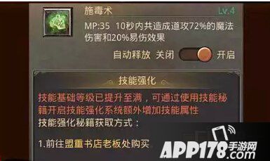可通过使用技能秘籍开启技能强化系统,额外增加技能属性。技能强化可以到盟重书店进行购买。