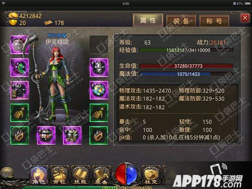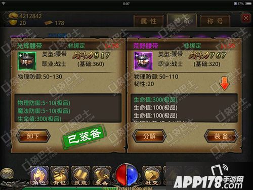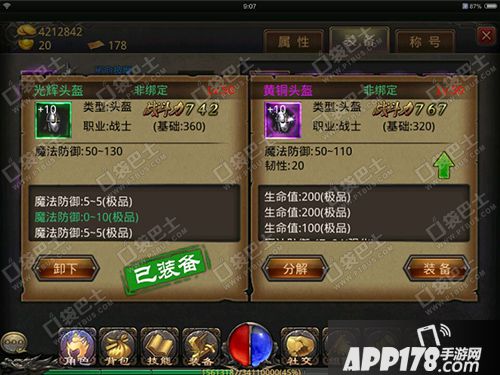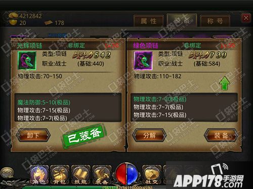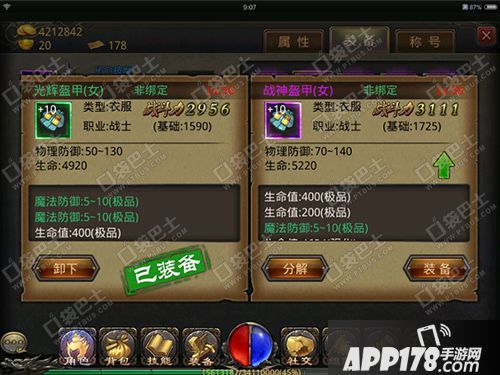 APP178手游网>热血传奇手机版>游戏攻略>选战力or属性? 紫装散件与光辉五件套对比