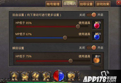 在喝药设置方面如下图所示比例,因为我血量在3W2左右从设置75%喝大太阳水,如果自身血量比较少的话可以适当调高下。