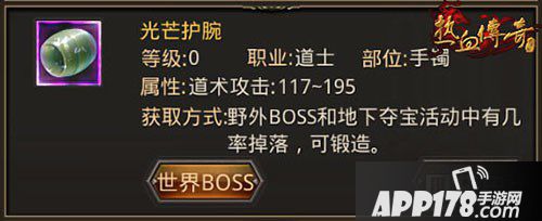 光芒护腕:道术攻击117-195,光芒护腕可以提供比较高的道术攻击属性加成。需由9个金刚石锻造方可获得,野外BOSS和地下夺宝活动中也有一定几率掉落光芒护腕。