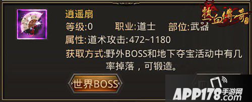 逍遥扇:道士武器的攻击当然是越高越好,所以通过野外BOSS、地下夺宝活动中几率掉落的逍遥扇自然也是顶级武器了,高达472-1180的基础道术攻击属性非常不错,虽然最小和最大值之间差的比较多,不过花费祝福油的话可以让武器打出最大化伤害。此外,玩家还可花费16个金刚石锻造出逍遥扇。