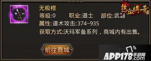 无极棍:无极棍是沃玛军备系列,玩家可以在商城中花费6480元宝购买武器箱,打开后即可获得无极棍。作为除逍遥扇和玄天外的拥有最高道术攻击的装备,无极棍可谓是最具性价比的顶级装备了!道术攻击的基础属性值为374-935,虽与逍遥扇和玄天的武器属性仍有差距,但是对于普通玩家而言,也是非常好的装备了!