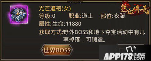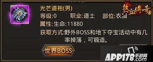 光芒道袍(男)/光芒道袍(女):物理防御210-420,生命值11880,防御和生命的双属性加成,可以让道士职业变得更为均衡。光芒道袍是由28个金刚石锻造而成,有极小几率从野外BOSS或地下夺宝活动中掉落。