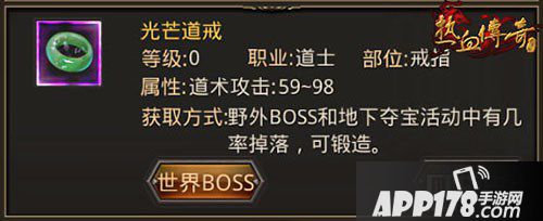 光芒道戒:道术攻击59-98,提供道术攻击属性虽相较于光芒项链和光芒护腕而言不算高,但是相对于其他同类戒指首饰,却是最高的属性了。光芒道戒可通过5个金刚石锻造获得,也有一定几率从野外BOSS和地下夺宝活动中获得。