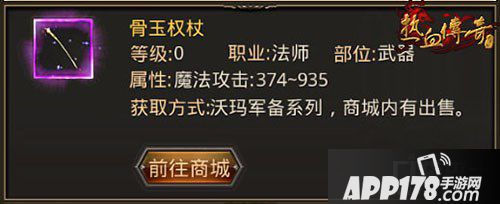 骨玉权杖:骨玉权杖是沃玛军备系列装备,玩家可以在商城中花费6480元宝购买武器箱获得。基础魔法攻击属性为374-935,虽然最小攻击属性低于启天的400-800,但是最高法攻属性却要高出启天135点,这个最小攻击属性的不足,可以通过使用祝福油来填补。除了通过商城购买获得,玩家亦可花费3个金刚石来锻造制成骨玉权杖。