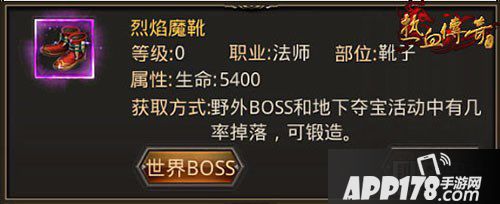 烈焰魔靴:生命5400,魔法防御210-420。可以消耗20个金刚石锻造获得,亦可通过野外BOSS和地下夺宝活动中获得。