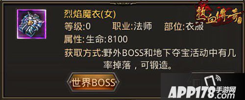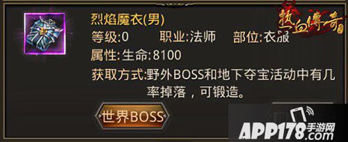 烈焰魔衣(男)/烈焰魔衣(女):烈焰魔衣基础属性生命811,物理防御210-420。烈焰魔衣可由28个金刚石锻造而成,野外BOSS和地下夺宝活动中也有一定几率掉落。