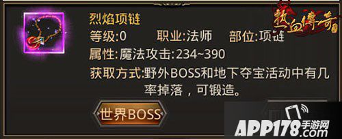 烈焰项链:烈焰项链基础魔法攻击属性为234-390,可以为玩家提供非常多的攻击力加成。玩家可以花费12个金刚石锻造出烈焰项链,也有几率从野外BOSS和地下夺宝活动中获得。