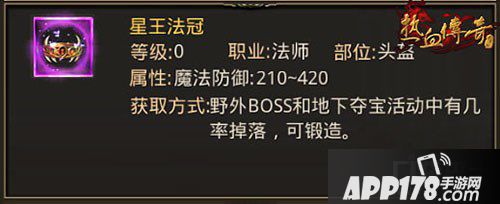 星王法冠:星王法冠是法师职业中最顶级的头盔,基础魔法防御属性为210-420。星王法冠是由36个金刚石锻造而成,也有极小几率从野外BOSS或地下夺宝活动中掉落。