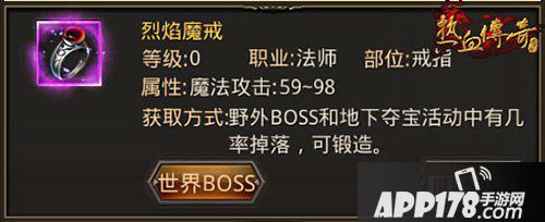 烈焰魔戒:魔法攻击59-98,比法师职业其他戒指属性要高出许多。玩家可以花费5个金刚石锻造出烈焰魔戒,野外BOSS和地下夺宝活动中也有几率掉落。