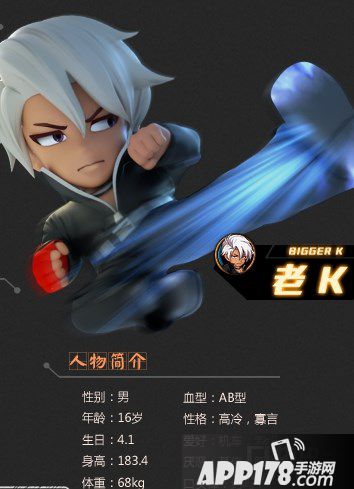 技能介绍:影之杀:在手掌周围环绕冰焰,向前猛烈冲击前方敌人,以冷焰横扫一切!连环踢:腾空向前方连续踢出夺命连环踢,老K连续必杀最佳的起手技!魔炎破:将冰焰从全身突然爆发而出,并猛烈攻击地面,造成大范围的伤害。是老K攻防一体的神技!冰焰奥义:瞬间引燃最强的冰焰,将老K的速度、攻击催生至极致!将全屏敌人秒杀!