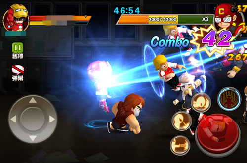《热血街霸3D》作为一款无厘头格斗手游,并没有采用当下风头十足的手势操作系统或是分频操作模式,而是采用了经典虚拟按键系统。大大的红色摇杆和熟悉的5键按钮,能让众多忠实的动作格斗游戏的玩家1秒上手;简洁经典的设计,也让一般向玩家能快速熟悉操作。