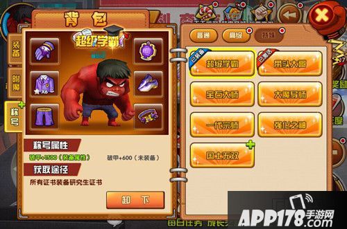进入背包,我们就可以看见称号系统啦~有让你翻白眼的“招狗咬体质”,还有中二气息浓重的“主宰教学楼”;有霸气侧漏的“我要打十个”,还有令人羡慕的“强化之神”,总之称号就是,满足一切君之想!选择一个自己喜欢的戴在头顶上招摇过市,啧啧啧,骄傲的简直就像开屏的雄孔雀,小苍老师都不好意思看了呢,只能偷偷从指缝中偷窥啦~