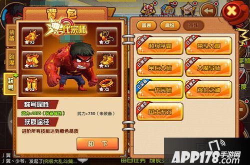 称号也不是信手拈来的,也是分三六九等的。这里我们简♂单♂粗♂暴的分成三类,分别是普通、高级以及特殊称号。当然并不只有名称上的变化,仔细看就会发现,称号的装备与否直接影响到人物属性。这里小苍老师分享一个小经验吧,如果之后要挑战的是“魔王任务”或者“街头争霸”这种需要强攻击力的副本,那么就暂时装备称号 “一代宗师”,战力嗖嗖嗖的往上涨~反正对于娇弱的不喜欢战斗的女孩子来说,奖励拿到就一切OK啦~