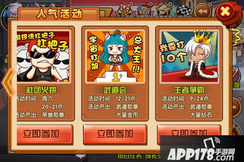 打开人气活动,在末尾找到最火爆的王者争霸活动。每天的9点到24点,玩家们可以在这里无限制挑战自我操作,《热血街霸3D》不再是一个只有PVE的游戏。在王者争霸赛中,只要你想战,便有人当你的对手应战。到底是青铜战五渣,还是最强王者藐视天下,尽在童鞋们的掌握。