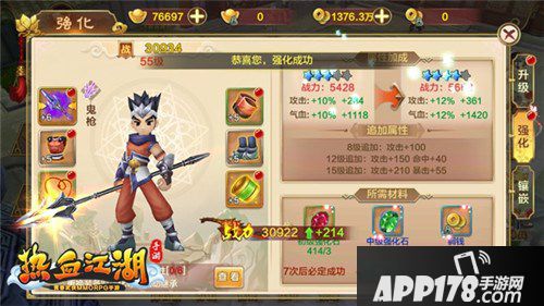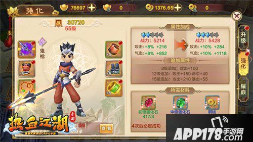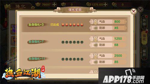 装备强化后,人物属性会得到大幅度提升,即时在副本或竞技场能够取得更大优势,因此当资源足够时,及时的强化当前等级适合的套装十分重要,在闯荡江湖的同时,各位大侠要对自己好一点哦!