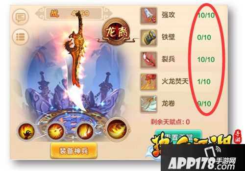 输出型:强攻+10 铁壁+0 裂兵+10 火龙焚天+1 龙卷+9