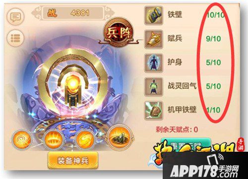 全身防御:铁壁+10 赋兵+9 护体+5 战灵回气+5 机甲铁壁+1