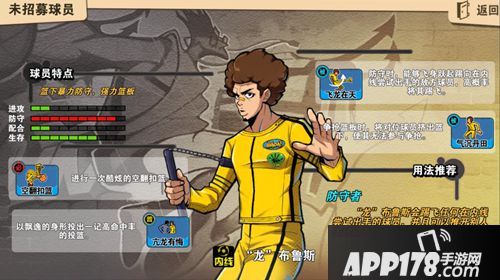 手持双节棍的布鲁斯作为内线位置的防守者,擅长篮下防守,值得一提的是,在每个球员的培养过程中,玩家将会获得球员通用秘技和球员专属秘技,专属秘技的装备将对球员特色能力有大幅度提升效果。