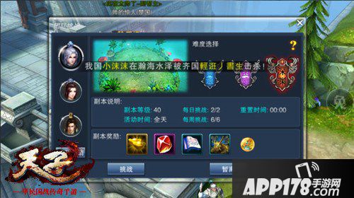 在平时的游戏过程中,有很多机会会和其他玩家接触,俗话说的好,一个好汉三个帮,团队的力量才稳定有依靠,和小伙伴们成群结队的前往边境完成押运粮草和火烧军营的任务,去敌国领土击杀敌国玩家来灭灭他们的士气。在完成任务的同时,还会积累日常活跃度,当活跃度积累到70时,就会有机会获得十方聚义令了。使用后需要召集两位40级以上的小伙伴,可选普通、困难、深渊三个难度来挑战团队副本。