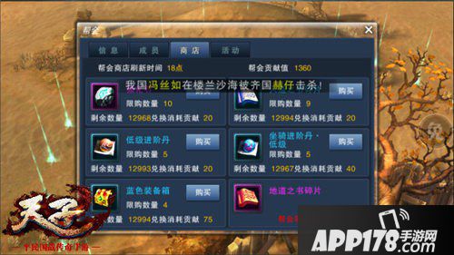 玩家角色等级达到23级时便可激活帮会系统,可以选择创建帮会和申请帮会两个方式。创建帮会需要花费100万铜钱,还需要帮主在世界频道宣传帮会,以吸纳众英雄豪杰前来加入。帮会除了帮主以外,还可以任命两位副帮主和四位长老,作为帮会的核心力量,管理帮会的上上下下。进入帮会的每一名成员,每天都可捐献一次,捐献会获得帮会贡献,可用于在帮会商店中购买物品,捐献达到一定程度时,会提升帮会的等级。帮会的等级决定了帮会人数和商店中开放购买的物品数目。