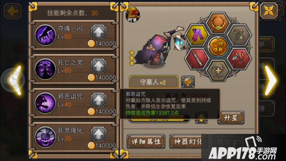 邪恶诅咒:对最后放技能释放诅咒。使其受到持续伤害(类似点燃,共5次),并降低生命恢复效果。守墓人招牌技能,也是重要输出技能。我目前的持续伤害是13000+,这仅仅是是个小技能而已。众所周知大部分输出英雄都在后排和中排,这些人因为脆所以需要保护才能保证输出。而守墓的这个技能不仅仅有可怕的持续伤害,还降低生命恢复。可以说是戳到了后排的软肋,并把这个突破口不断扩大,直到从后方瓦解敌人的整个队伍。