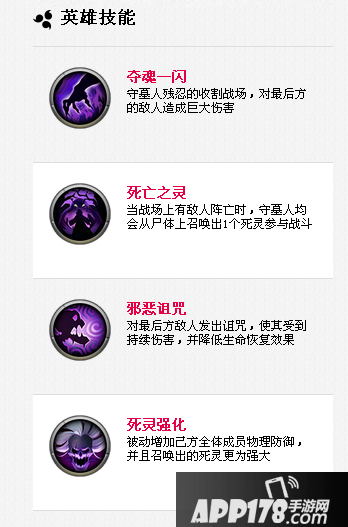 死亡之灵:只要敌方有人阵亡,就会原地召唤一名死士跟随战斗。这个技能实际是一个辅助技,因为死士是不会模仿敌方发出技能的,只会平砍。而且伤害没有超过也就150—200左右……但是这个技能是变相保护整个队伍的!因为他会迫使敌方中排甚至前排回头,让敌人的技能各种放空(就是扔给了死士),当然了,对于百灵、猪娃娃等这种技能必中的英雄是没有办法的啦~