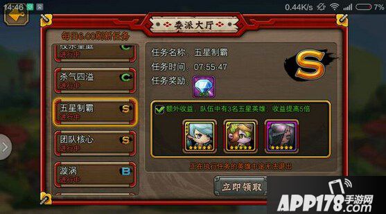 更新后的委派大厅将任务系统改变,每天可领取10个任务,任务等级分为S、A、B、C四个等级。每个等级的任务类型不同,任务结束所给予的奖励也不一样。S级别的任务奖励最好,C级别的奖励最差。每一项任务都有额外达成条件,完成这个达成条件之后可以领取额外奖励,这个额外奖励可是重头戏,可以获得额外收益的N倍奖励,随任务难度的不同,翻的倍数也不一样。这就考验玩家的英雄池了。英雄池广的玩家可以充分利用英雄来完成不同种类的任务,从而拿到其额外的加成奖励。每天委派大厅分配的任务都是随机的,有的人S级别的任务多,也有的人A级B级的任务多,这些都不是固定的,完全看RP而定。而完成这些任务的难度,其实就看你账号的实力来定了。S级别的任务可以翻5倍的加成奖励,但达成条件也比较苛刻,需要一些初始三星橙色英雄,这其实就是为高V玩家准备的福利了。高V玩家英雄池深度广,完成任务的机会就大很多。而对于低V玩家或者新区玩家来说,英雄池较浅,只能酌情完成一些较低难度的任务。