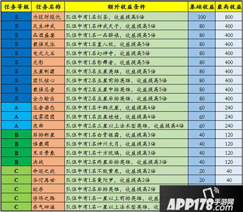 从最低的C级任务到最高的S级,额外收益条件限定的忍者获取和培养难度也逐渐增加,但是收益更是成倍地增长。如果委派大厅的10个随机任务全是S级,并且都满足额外收益条件的话,一天就能收获4400钻石!是不是超惊喜呢?